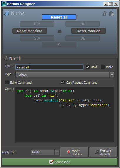 The second 'tip' of this whole story, is to put our complete redeclaration (of the createSelectMenuItems function) inside a scriptNode which will be loaded each time scene is started, which can be useful in a studio for instance, when a rigger has defined properly this menu he can integrates it in his rig scene, so every animator opening the scene will have the menu override, so they can animate better and faster... maybe stronger =).