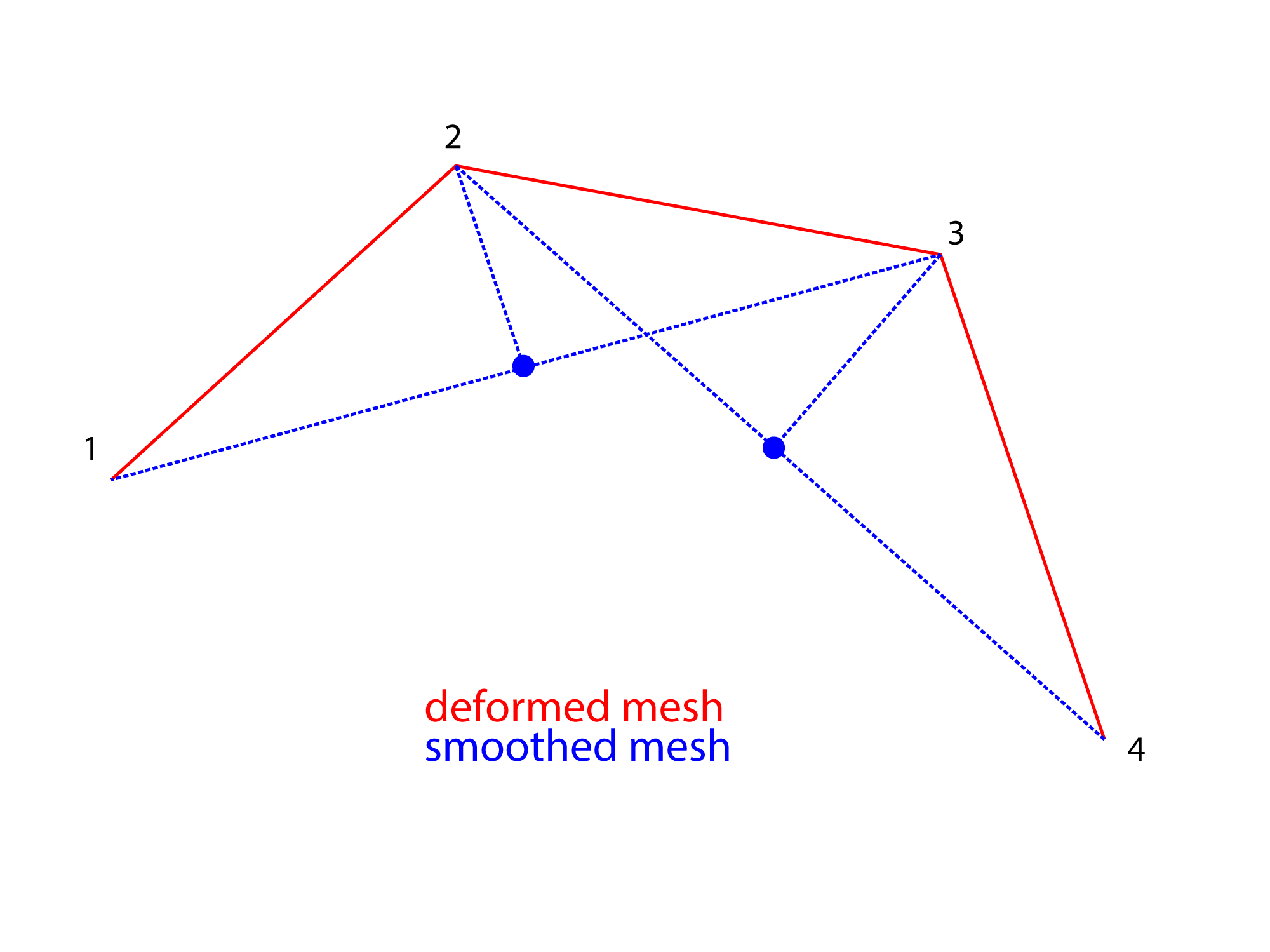 Now imagine you'd like to make it smoother, regardless of the volume. How can we do it ? By doing an average between every vertex. In other words, let's assume we work on vertex 2 : if we want to make it smoother within the mesh, we need to work with vertices 1 and 3. So first, let's get the centroid of verices 1-3 (or as we work in 2D, the midpoint of segment 1-3).
