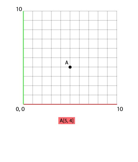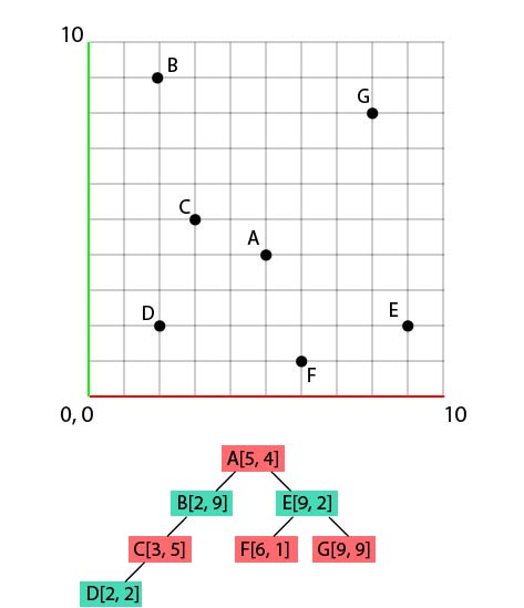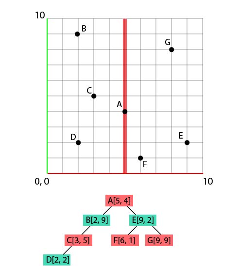 While doing that, let's also add A at the bottom, under the grid. This first 'node', below the grid, will be our 'root' node for this tree. Then, we populate information just like any type of tree. Each node has children, each child has other children, and so on and so forth! In the case of a k-d tree, there are always 2 children, one on the left, one on the right. Now, how to define if a child should take place on the right or the left ? By comparing the position values, dimension by dimension.