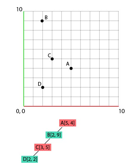 We'll generate, from this set, a k-d tree, and put those points on a 2d grid at the same time. Let's start with A. Nothing crazy here: