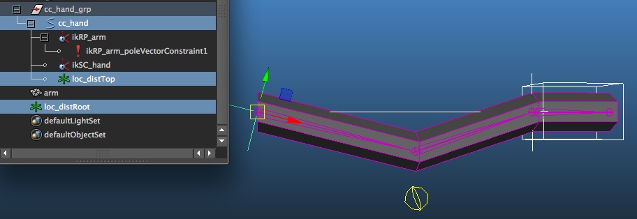 Firstly, we'll need something to measure in real time the arm distance when straight. You can already create 2 locators. The first one (loc_distRoot) will be snaped to the shoulder while the second (loc_distTop) will be snaped (and parented) to the cc_hand. Of course, be careful to not parent the second locator to the wrist bone itself, which will be scaled (if you do so, you'll end up with a cycle: the wrist bone will move the locator, which will increase the scale in the wrist bone, which will cause the locator to move, and so on)