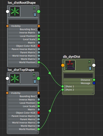 Graph now those two locators in your node editor (our interest is on the shapes, not the transforms). The interest of using locators is that they come with a very handy attribute called worldPosition, which gives us a world position regardless the parents' hierarchy. Create then a distanceBetween node (db_dynDist), and connect the loc_distRootShape.worldPosition to the point1 of your db_dynDist, and the loc_distTopShape.worldPosition to the point2 of your db_dynDist. No surprise here, your distanceBetween node returns now, through its attribute 'distance', the always up-to-date distance between shoulder and wrist