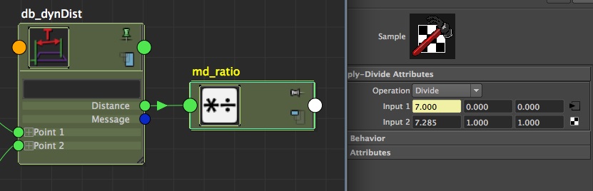 Now that you have your two distances, you just need to create a multiplyDivide node (md_ratio). As an input1X, connect the dynamic distance from db_dynDist, and as an input2X, set manually the fixed distance you stored. Finally, set your md_ratio on 'Divide'