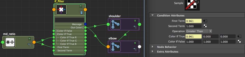 So what we want is to filter the result of the md_ratio node: if it's greater than 1 (i.e. if we need the stretchiness, because the dynamic distance is greater than the constant distance), we take the scale value from the output md_ratio. If it's the opposite (the arm is folded), then we return 1, the default scale value. Create a condition node 9if_filter) and connect the md_ratio.outputX to its firstTerm, and to its colorIfTrueR. In the second term, just enter '1', and set the operation to 'greater than'. Now, if the first term (our ratio) is less than 1, the condition will return colorIfFalse (as our condition will be False), which is 1. But if the firstTerm is greater than 1, our condition will return colorIfTrue, which is the ratio =] You can now connect the outColorR of your condition to your shoulder and elbow scale X (if you oriented your joints in X, or scaleY if you orient your joints in Y...).