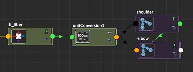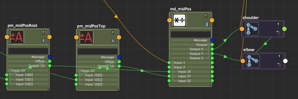 Create then a multiplyDivide (md_midPos), and connect your pm_midPosRoot.output1D to md_midPos.input2X, and your pm_midPosTop.output1D to md_midPos.input2Y (so that we'll use the same node multiplyDivide for the two parts (shoulder and elbow)) Then, connect the if_filter.outColorR in the input1X and input1Y of your md_midPos.multiplyDivide. Voila, you now have a multiplier factor for your joints (and it's the dream of many people (at least me) to be able to multiply joints...)! Last thing to do, connect the outputX to the joint(s) of the first half and the outputY to the joint(s) of the second half. Of course, for the arm, there is only one joint on each side of the 'midpoint'.