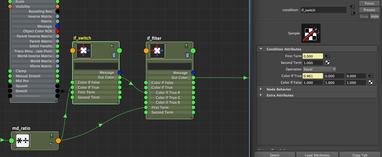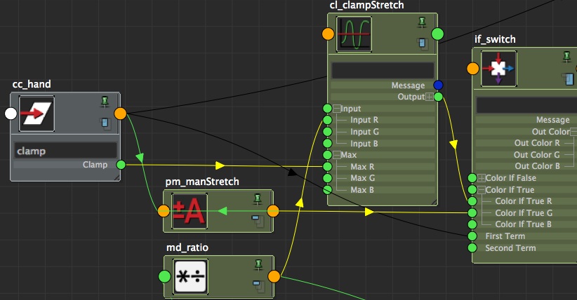 The idea behind the clamp is super simple: we add a clamp node (cl_clampStretch) between the ratio and the first condition, to let the animator choose the max value of its stretch. Graph your md_ratio, and plug its outputX in cl_clampStretch.inputR. In maxR, plug the value of the clamp attribute (coming from cc_hand). Finally, plug the result of cl_clampStretch into the colorIfTrueR of your very first condition if_switch. We just added the clamp between the ratio and the if_switch.
