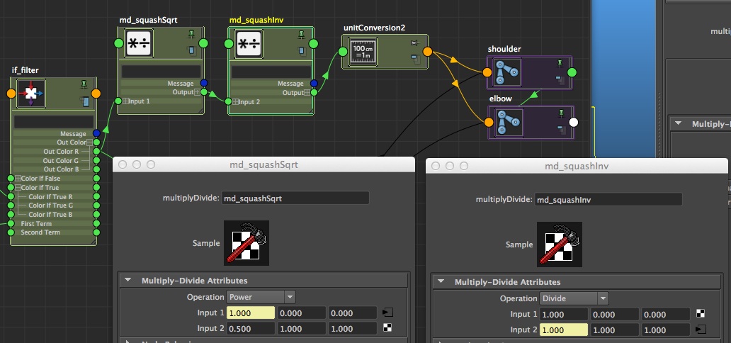 First things first, the most common formula - and the one we'll use here - for volume preservation, at least in 3D, is 1 / square root of the ratio. Keep that in mind, although you can find it on the formulas page if necessary =] Now, applied to our situation, let's see what it gives. The outColor coming from the if_filter is the correct value, our ratio that will always be ok (the one that the animator will want). Therefore, all we have to do is to take this value and apply the formula we saw, that we'll re-plug after in scaleY and scaleZ (considering you orient your joints in X, once again). So let's do it! To begin, we need to apply the 'square root' operation. Take the if_filter.outColorR, and plug it as input1X of a multiplyDivide node (md_squashSqrt). Set the type of operation to 'pow', and the input2X to 0.5. Remember your highschool classes, applying a power of 0.5 is the same thing than doing a squareroot^^ Connect then the outputX into a input2X of a new multiplyDivide node (md_squashInv), then set the type of operation to divide and the input1X to 1. This node will return the inverse of what is given to it. Finally, connect this outputX to the scales Y and Z of your joints (or to another dummy unitConversion as we saw earlier =)