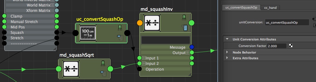 Finally, for those of you using python (or mel), know that you can also create an attribute enum that will return what you want (instead of 0 and 1). For example, if i run this: cmds.addAttr('cc_hand', ln='squash', at='enum', enumName='off=0:on=2', k=True) Our squash attribute will return - by default - 2 when it'll be On, which allow us to get rid of the unitConversion node =]