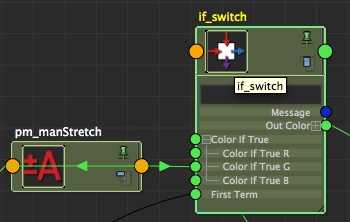 Boom, done! We have our value of '1'! So now you can connect it to your first condition (if_switch). We'll use the channel colorIfTrueG though, instead of R. Indeed, we'll make this value pass through this node, but we also need to filter it out, regarding the value of the stretch attribute (on/off). So plug your pm_manStretch.output1D into the colorIfTrueG of your if_switch condition.
