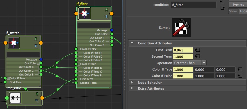 Then, keep the if_switch.outColorR into the if_filter.colorIfTrueR, but plug the if_switch.outColorG into to colorIfFalseR, and in the secondTerm. Keep the ratio as the first term, as well as operation on the if_filter (greater than).
