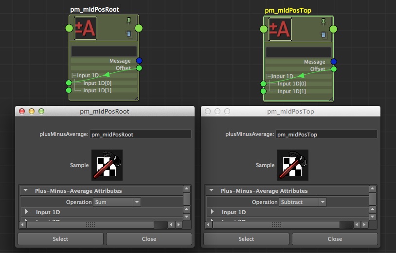 Let's start by creating 2 plusMinusAverage (pm_midPosRoot and midPosTop), with an 'offset' attribute of 1 on each, that you'll connect to the input1D[0] of themselves (we did it already, you know how to proceed now!). The difference between those 2 plusMinusAverage will be that the first (root) will be set to 'sum', while the second (top) will be set to 'substract'.