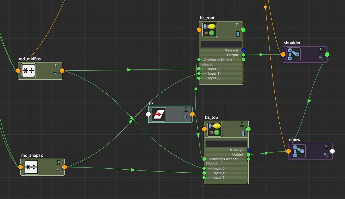 The 'trickiest' part, now, consists in merging all of that with our complete system already created. But if we think about it, we realise that this last option should override all other options (of course, we don't want to use it when the arm is stretched out. Or if we do so, the the arm should fold). So all we need to do is to add a blendTwoAttributes to ... blend those two attributes (the value we had until now, coming out from md_midPos, and the value of md_snapTo), driven by the attribute 'snapToPv' of your pole vector!